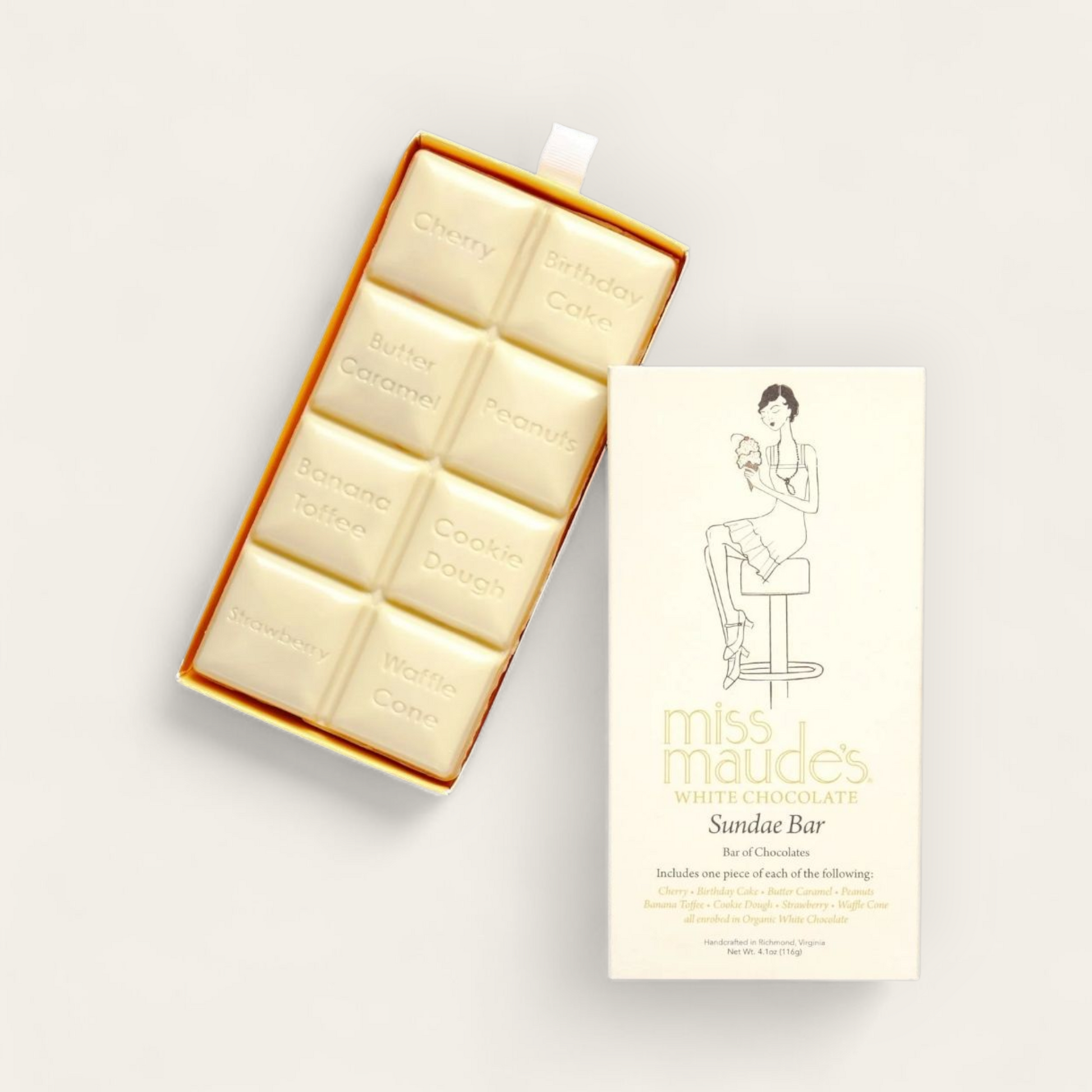 Cherry, Birthday Cake, Butter Caramel, Peanuts, Banana Toffee, Cookie Dough, Strawberry, and Waffle Cone enrobed in Organic White Chocolate.